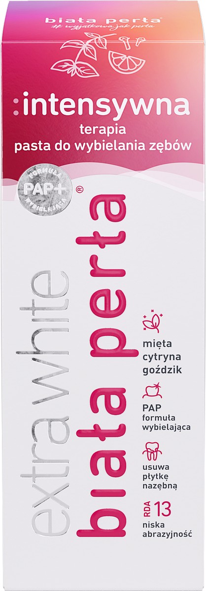 BIAŁA PERŁA Pasta + Intensywna Terapia przeznaczona jest dla osób pragnących uzyskać widoczny efekt rozjaśnienia szkliwa w krótkim czasie. Formuła enzymatyczno-oksydacyjna zapewnia intensywne wybielenie dzięki dokładnej penetracji szkliwa przez aktywne składniki pasty.