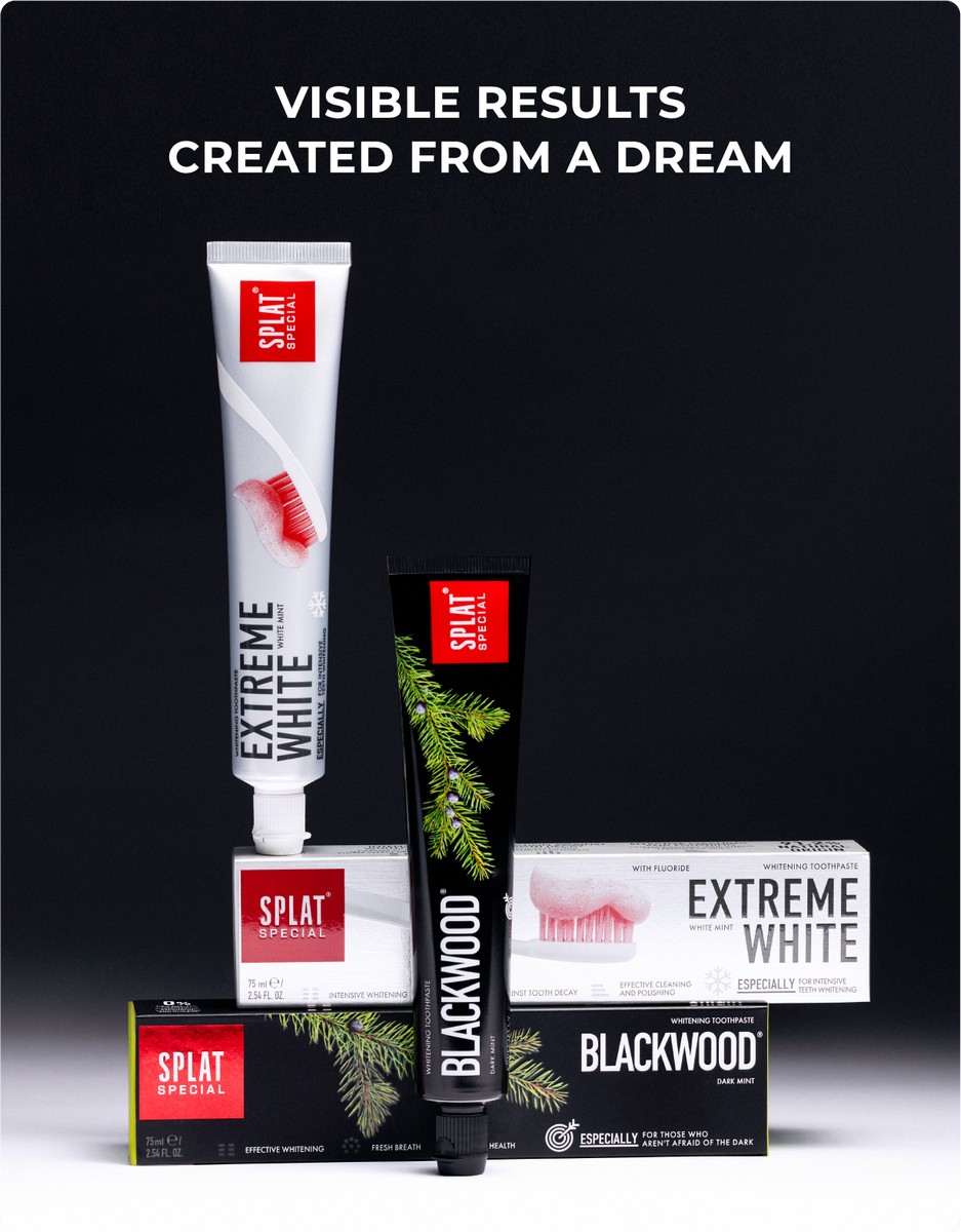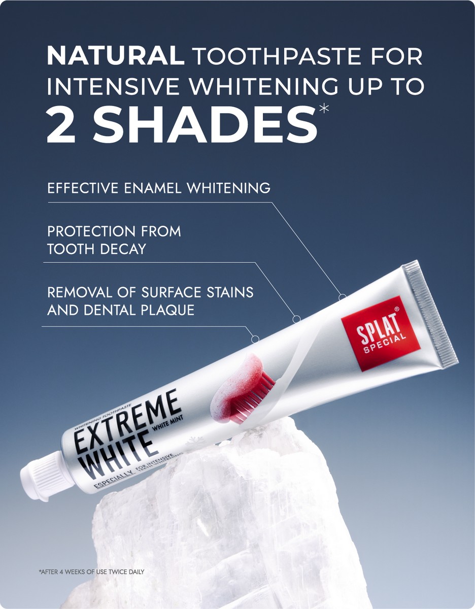 Pasta SPLAT Special EXTREME WHITE jest polecana do intensywnego wybielania szkliwa zębów. Doskonale chroni zęby przed próchnicą i wzmacnia szkliwo. Pasta zapewnia efekt wybielenia zębów już po 4 tygodniach stosowania i jest całkowicie bezpieczna dla szkliwa zębów. Aby osiągnąć jak najlepszy efekt wybielenia nie powinno się spożywać pokarmów i napojów 20 minut po stosowaniu pasty SPLAT Special EXTREME WHITE.
