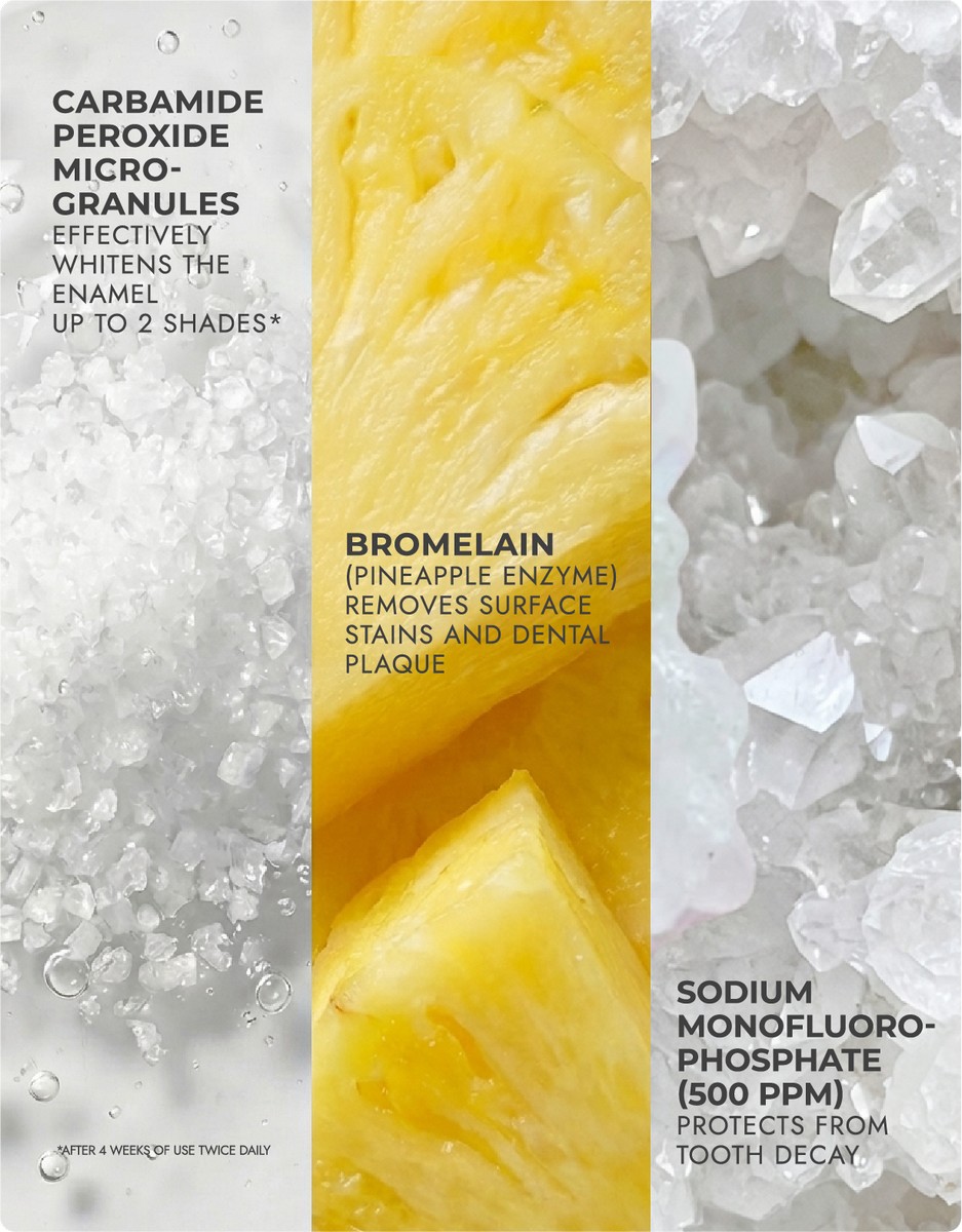 Aqua, Hydrogenated Starch Hydrolysate, Hydrated Silica, Dicalcium Phosphate Dihydrate, PEG-8, Sodium Lauryl Sulfate, Hydrogenated Palm Oil, Aroma, Xanthan Gum, Zinc Citrate, PEG-200, Sodium Methylparaben, Sodium Saccharin, Tetrasodium Glutamate Diacetate, Urea Peroxide, Lecithin, PVP, CI 77891, Sodium Fluoride, CI 73360, Sodium Hydroxide, Ananas Sativus Fruit Extract, Maltodextrin, Limonene, CI 16255.
