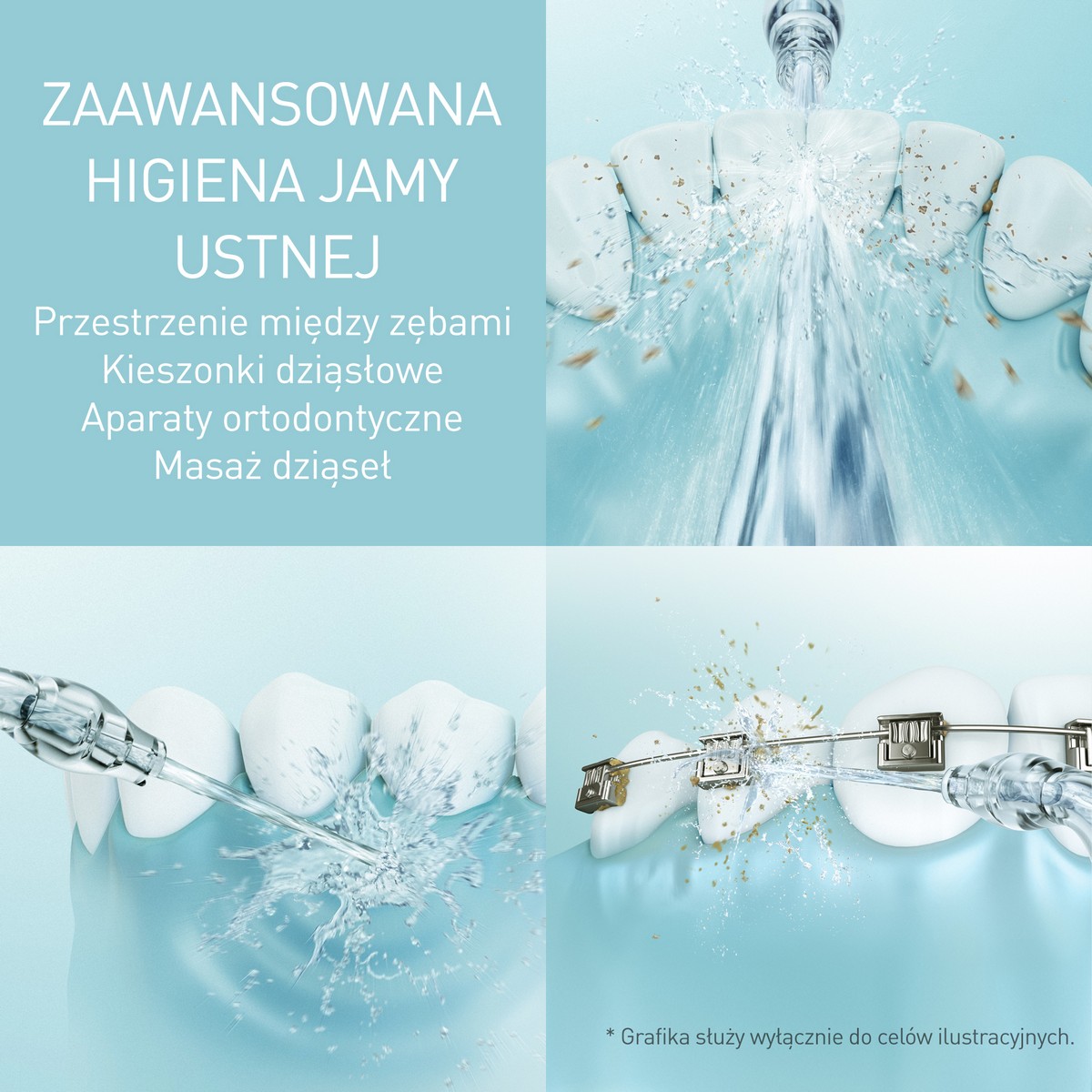 Dzięki połączeniu strumienia wody i zintegrowanej główki szczoteczki można łatwo usuwać kamień nazębny i resztki jedzenia z aparatów i mostów ortodontycznych.