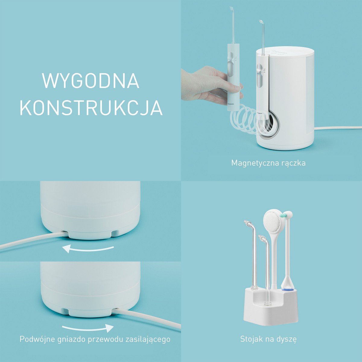 Zastrzeżona technologia ultradźwiękowa firmy Panasonic jest delikatna dla dziąseł, a jednocześnie umożliwia skuteczne usuwanie resztek jedzenia i bakterii z zębów i kieszonek przyzębnych. 10 regulowanych poziomów ciśnienia wody i tryb dziecka sprawiają, że z urządzenia może korzystać cała rodzina, od dorosłych po dzieci*.
