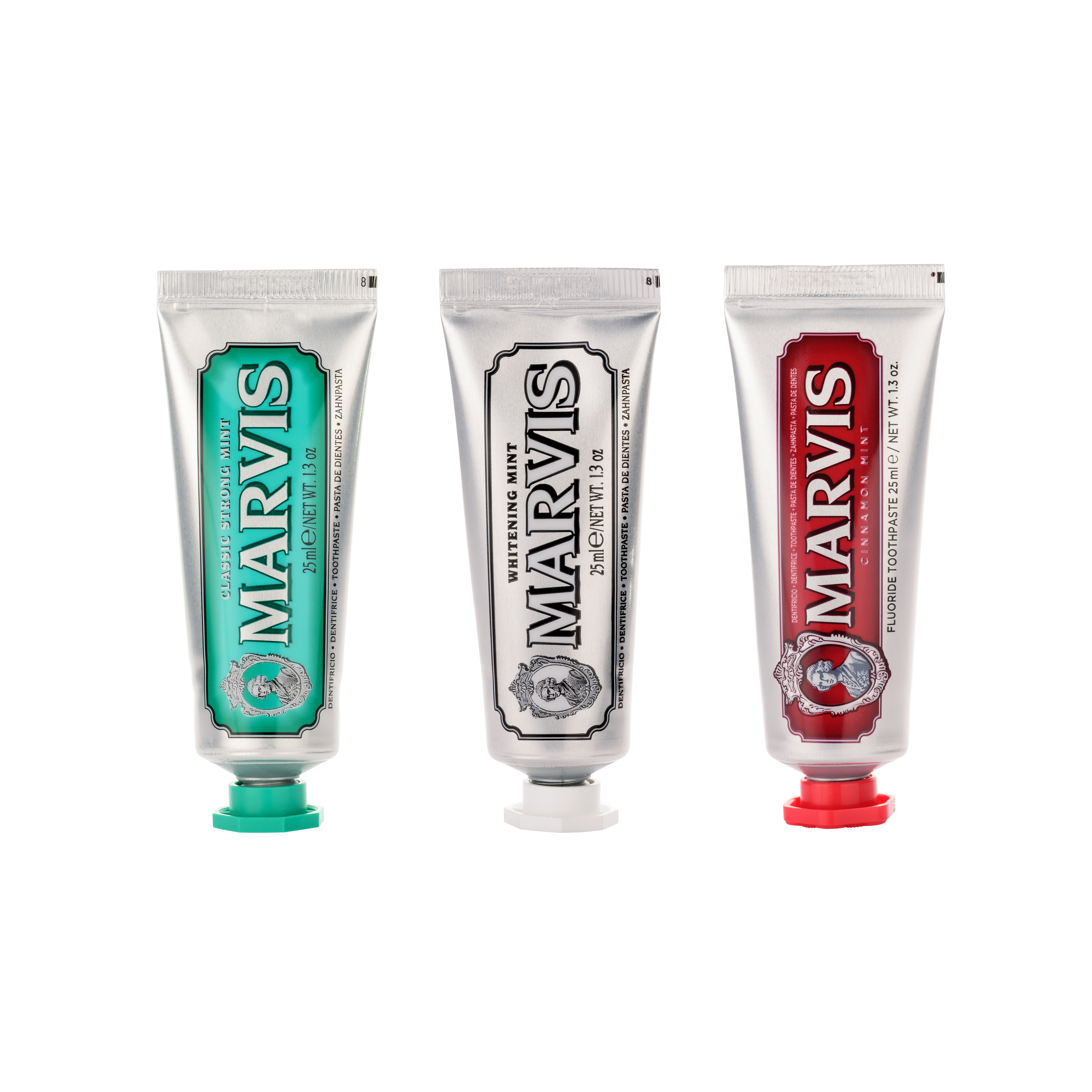 Marvis Cinnamon Mint: Calcium Carbonate, Glycerin, Aqua (Water/Eau), Hydrated Silica, Aroma (Flavor), Xylitol, Cellulose Gum, Sodium Lauryl Sulfate, Titanium Dioxide, Sodium Saccharin, Sodium Fluoride, Citric Acid, Sodium Citrate, Cinnamyl Alcohol, Cinnamal, Limonene, Eugenol.