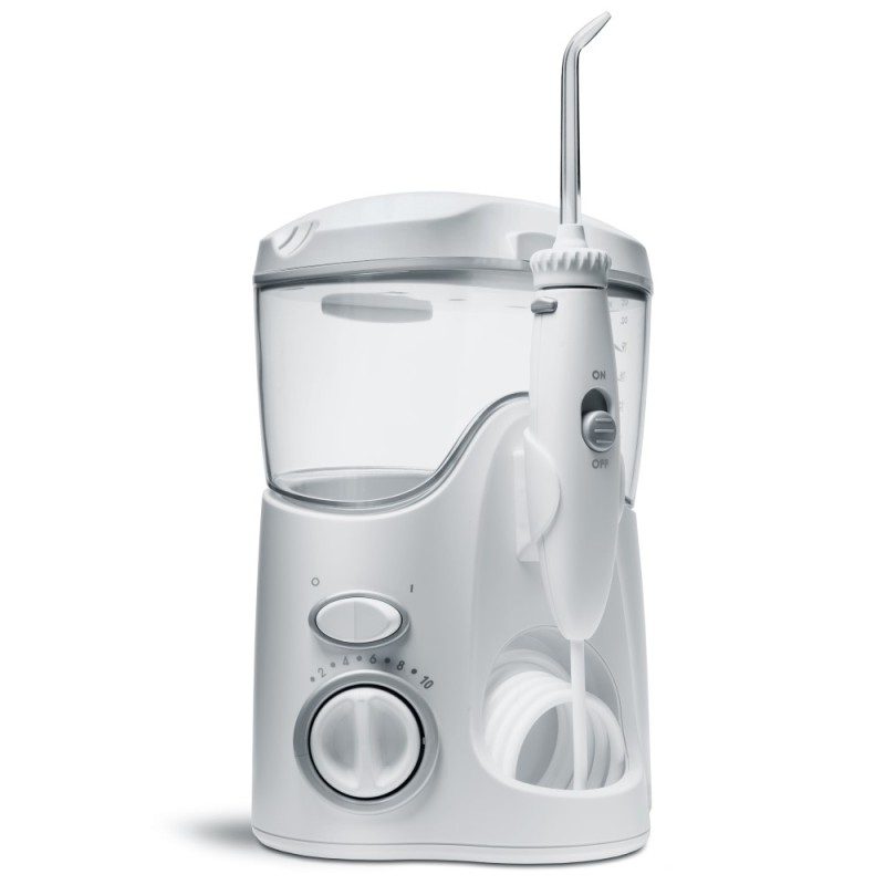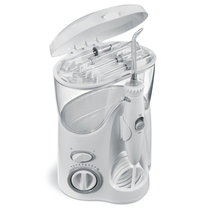 Waterpik WF-100 Ultra jest modelem stacjonarnym, wyposażonym w wygodny włącznik/wyłącznik wody na uchwycie oraz schowek na dodatkowe końcówki wbudowany w pokrywę.