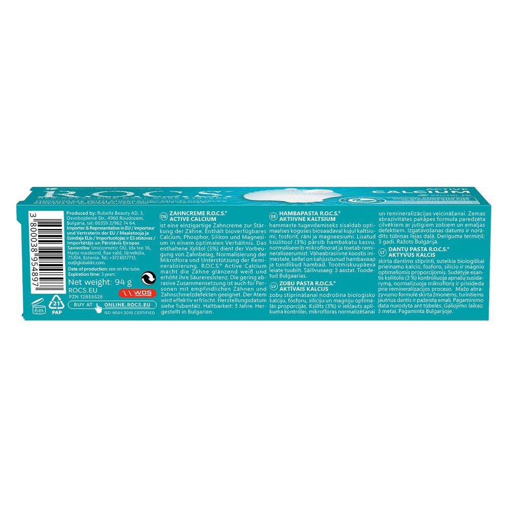 Pasta do zębów R.O.C.S. Active Calcium – Twój codzienny partner w osiąganiu nieskazitelnej pielęgnacji jamy ustnej! Ta uwielbiana pasta do zębów nie tylko czyści, ale także czyni cuda, przywracając mineralizację zębów, czyniąc je bardziej odpornymi na próchnicę i kwasy. Wzmacnia szkliwo, przywraca jego naturalny połysk i przywraca olśniewającą biel, o której zawsze marzyłeś!