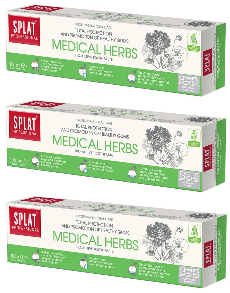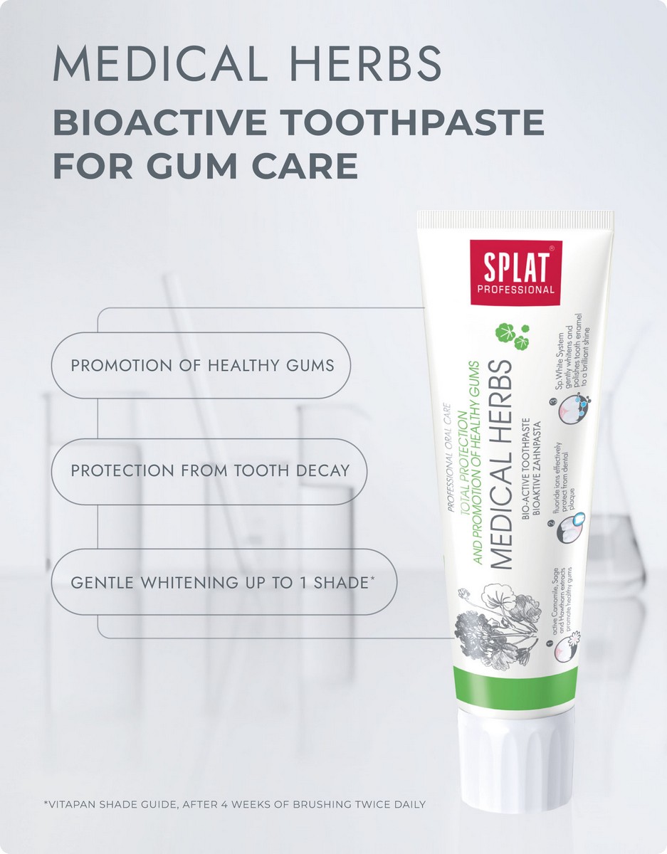 Pasta Splat Medical Herbs jest kompleksową ochroną i profilaktyką chorób dziąseł. Aktywne ekstrakty rumianku, szałwii i głogu tamują krew i działają przeciw zapalnie na dziąsła.