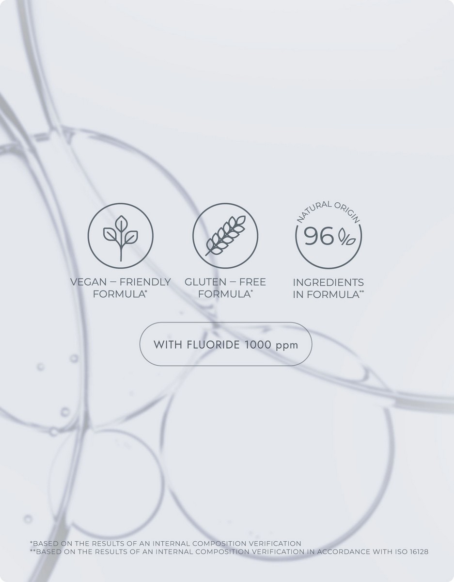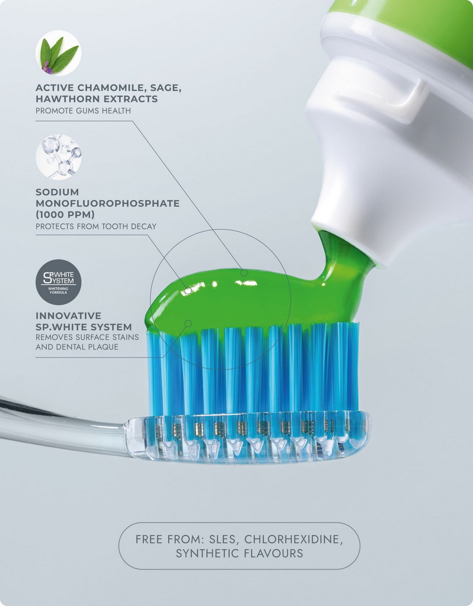 Skład: Hydrogenated Starch Hydrolysate, Hydrated Silica, Aqua, PEG-8, Sodium Coco-Sulfate, Aroma, Xanthan Gum, Calcium Lactate, Sodium Monofluorophosphate, PVP, Sodium Methylparaben, Sodium Saccharin, Propylene Glycol, Hippophae Rhamnoides Fruit Extract, Crataegus Monogyna Fruit Extract, Chamomilla Recutita Flower Extract, Salvia Officinalis Extract, Helianthus Annuus Seed Oil, Papain, Pelargonium Graveolens Stem Leaf Oil, CI 42090, CI 19140, Citric Acid, Sodium Benzoate, Potassium Sorbate, Limonene. Fluoride content – 0,1 % (1000 ppm).