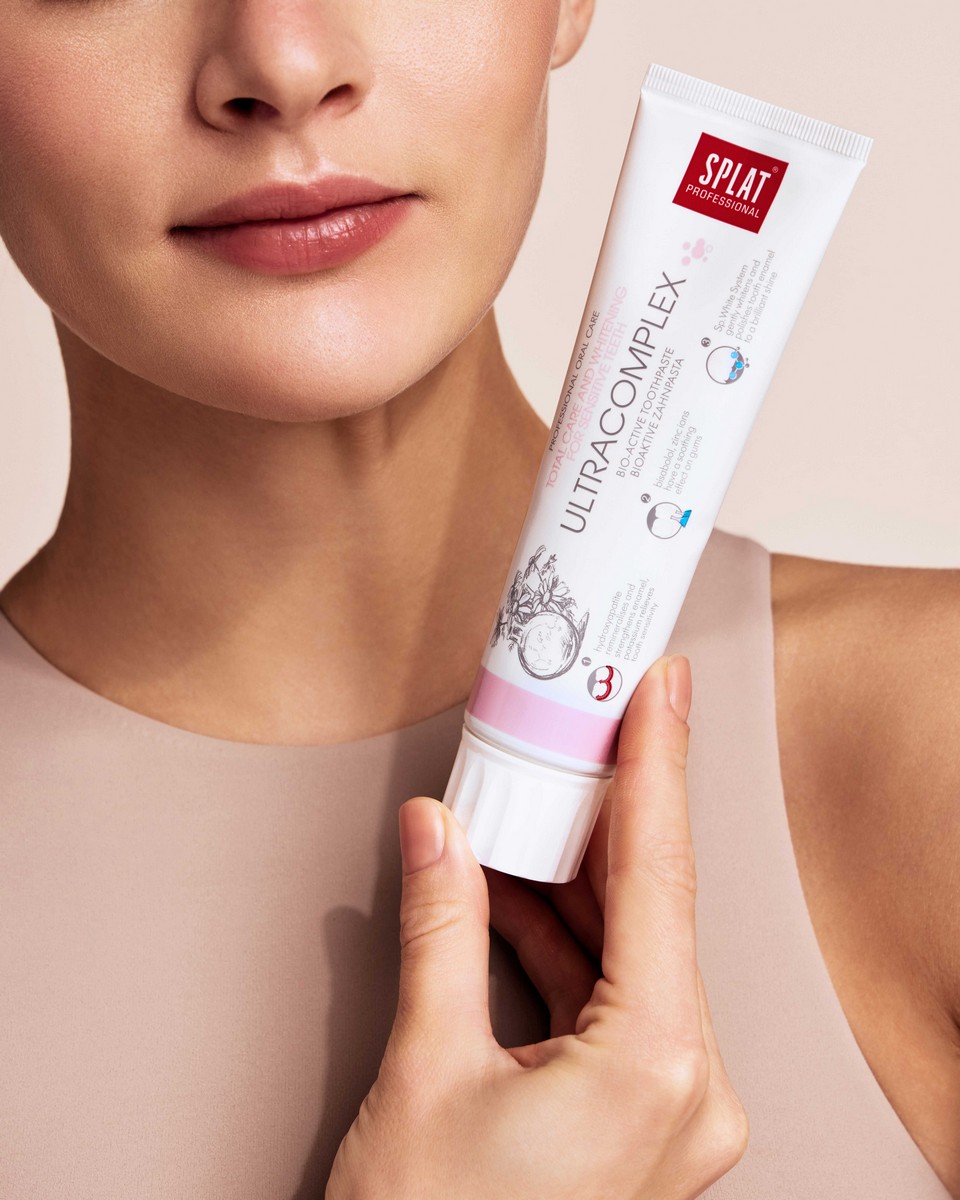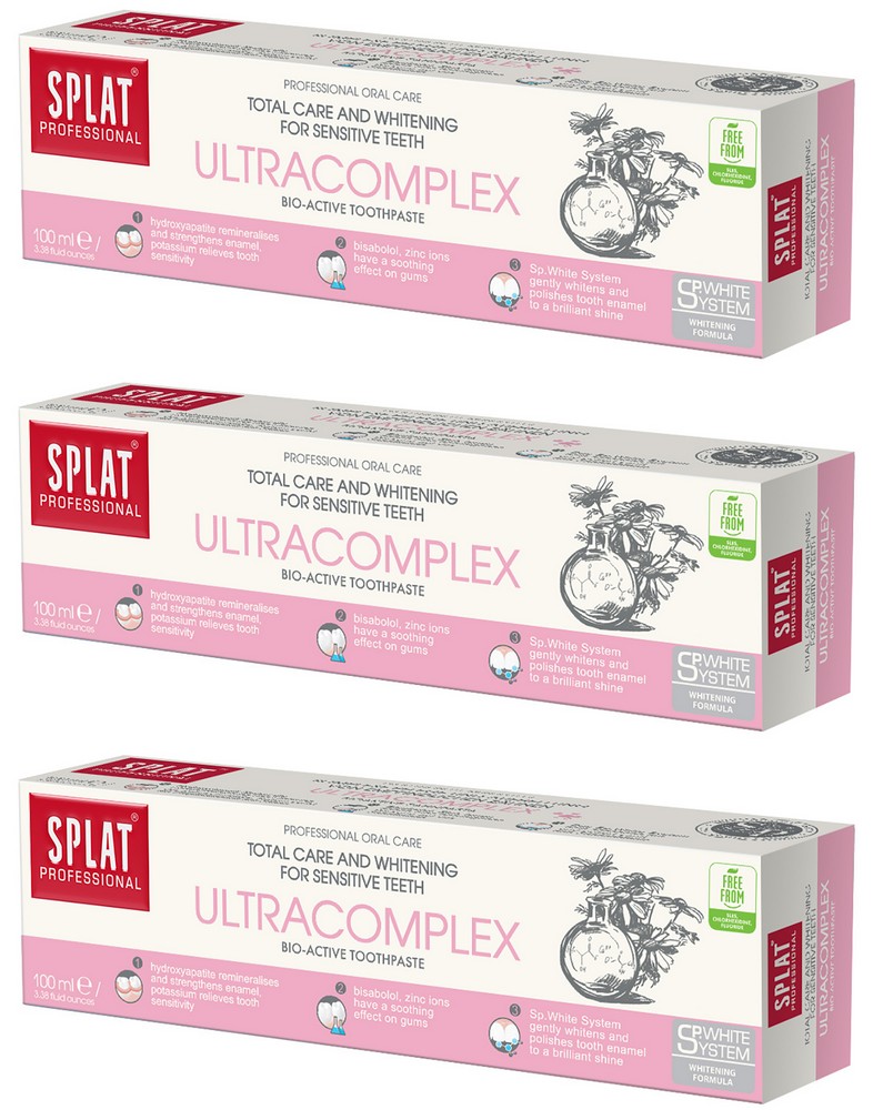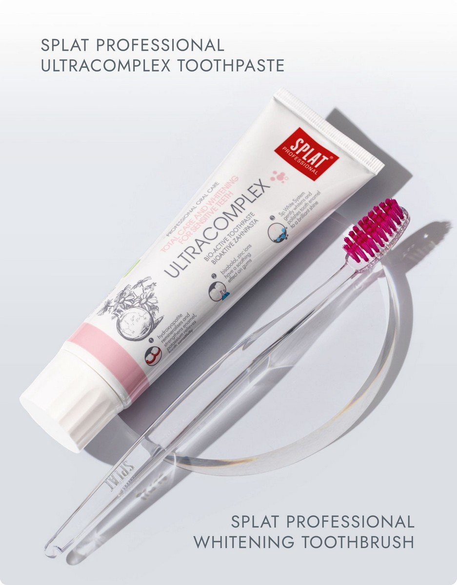 Pasta do zębów SPLAT Professional ULTRACOMPLEX to pasta dla osób wymagających. Posiada unikalne składniki działające na nadwrażliwość oraz system delikatnego wybielania. Organicznego pochodzenia - Kalcis, pochodzący ze skorupek jaj, w połączeniu z hydroksyapatytem skutecznie wzmacniają zęby, zwiększają gęstość szkliwa i eliminują przyczyny wrażliwości.Jony potasu i cynku zmniejszają wrażliwość szkliwa, oraz działają ściągająco i przeciwzapalnie na dziąsła.