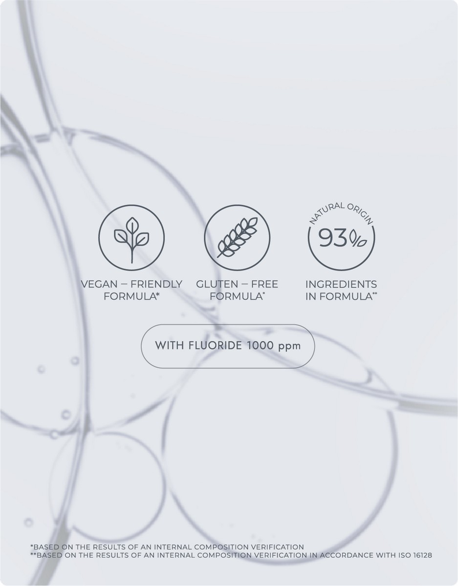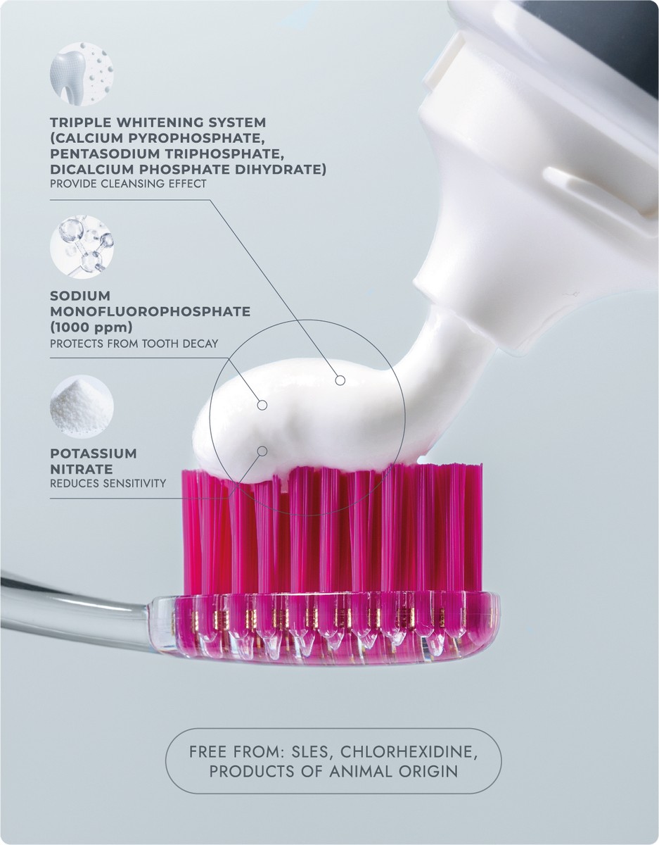 Skład:Aqua, Hydrogenated Starch Hydrolysate, Hydrated Silica, Potassium Nitrate, Dicalcium Phosphate Dihydrate, PEG-8, Calcium Pyrophosphate, Pentasodium Triphosphate, Aroma, Sodium Coco-Sulfate, Cellulose Gum, Sodium Monofluorophosphate, CI 77891, Sodium Lauroyl Sarcosinate, PVP, Sodium Methylparaben, Sodium Saccharin, Menthol, Papain, Limonene. Fluoride content – 0,1 % (1000 ppm).