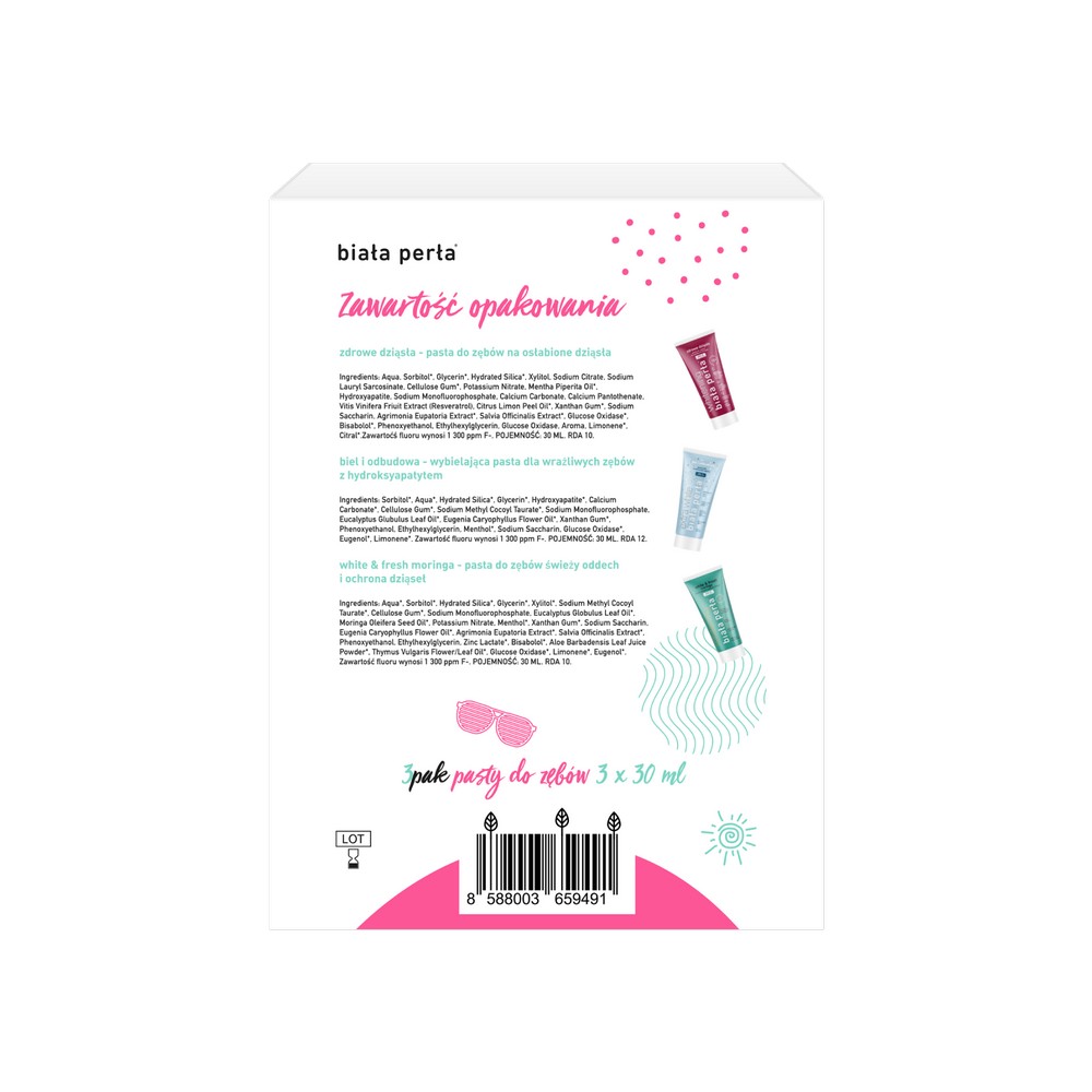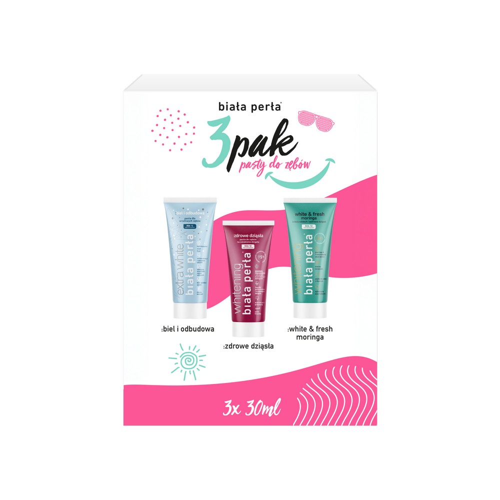 Zawartość opakowania: pasta biel i odbudowa, pasta zdrowe dziąsła, pasta white&fresh moringa
