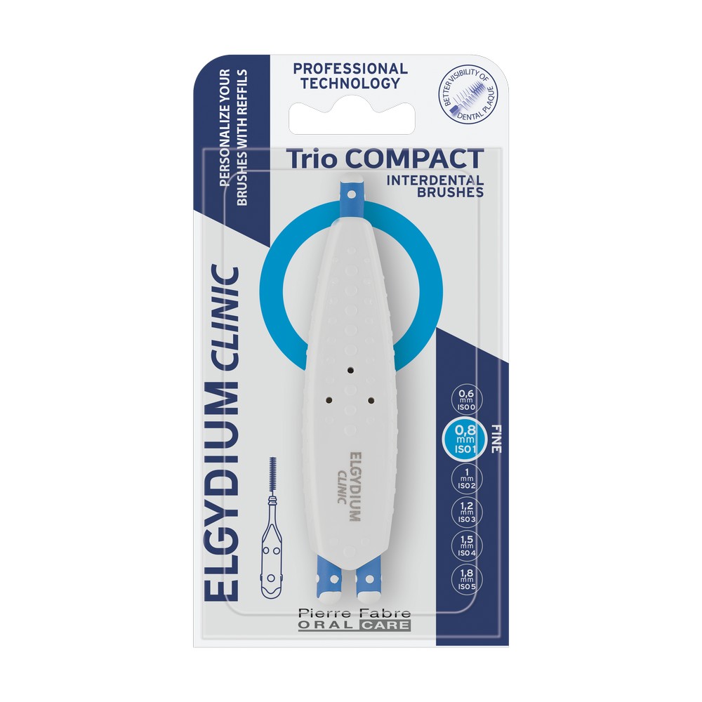 ELGYDIUM CLINIC TRIOCOMPACT to innowacyjne szczoteczki międzyzębowe, które zapewniają skuteczną higienę przestrzeni międzyzębowych, pomagając w usuwaniu płytki bakteryjnej i resztek jedzenia z trudno dostępnych miejsc.