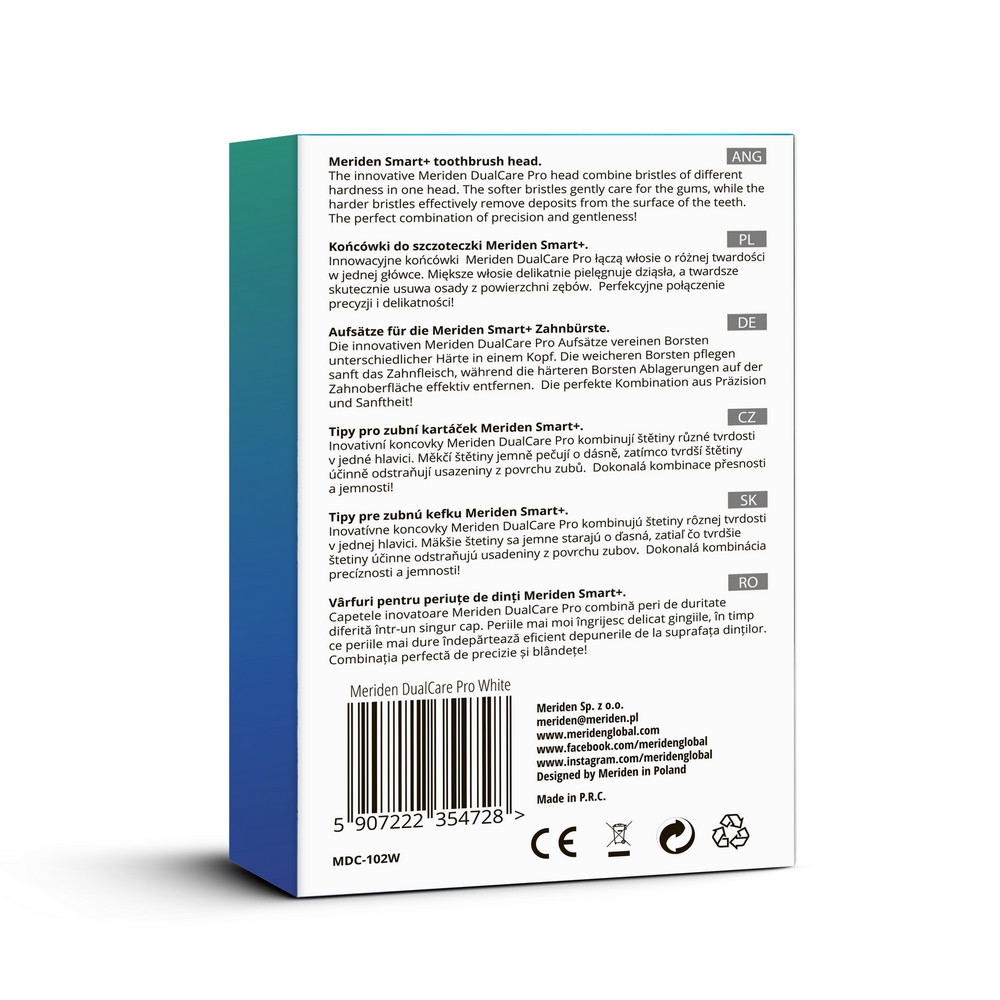 Specjalnie zaprojektowane końcówki Meriden DualCare Pro łączą w jednej główce włosie o różnej twardości. Miękkie włókna delikatnie pielęgnują dziąsła, a twardsze skutecznie usuwają osady z powierzchni zębów. To połączenie precyzji i delikatności. Końcówki dostępne są w wersjach kolorystycznych dopasowanych do korpusu szczoteczki.