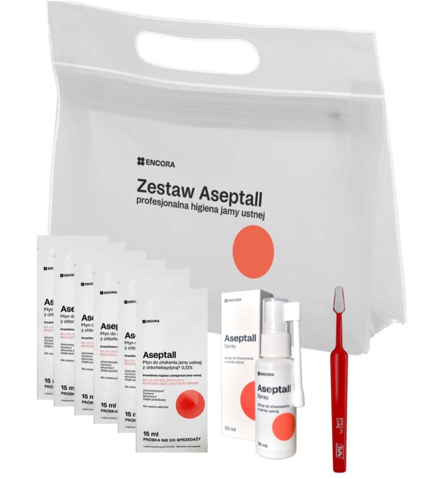 ASEPTALL START to zestaw stworzony dla pacjentów po drobnych zabiegach chirurgicznych, ekstrakcjach pojedynczych zębów lub usunięciu ósemek.