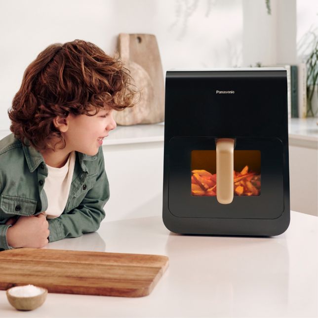 Delektuj się ulubionymi potrawami w zdrowszej wersji, używając niewielkiej ilości oleju lub nie używając go wcale. Wszystko, czego potrzebujesz, to frytkownica beztłuszczowa Panasonic, dzięki której przygotowywanie potraw zapewniających dobre samopoczucie będzie łatwiejsze i zdrowsze. Okienko, przepływ powietrza 360° i technologia delikatnej pary wodnej czynią różnicę. Szybko i łatwo przygotujesz chrupiące i soczyste ulubione potrawy.