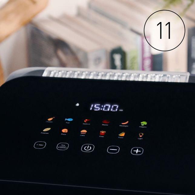 Zapomnij o zgadywaniu. Po prostu wybierz jedno z 11 wstępnie ustawionych menu, dotykając kolorowych, łatwych w obsłudze ikon na panelu LED: frytki, kurczak, ryby, owoce morza, steki, kiełbaski, warzywa, ziemniaki, pizza, ciasto i tosty. Jeśli chcesz, możesz dostosować działanie, ustawiając własną temperaturę i czas – od 1 do 60 minut i od 80°C do 200°C.