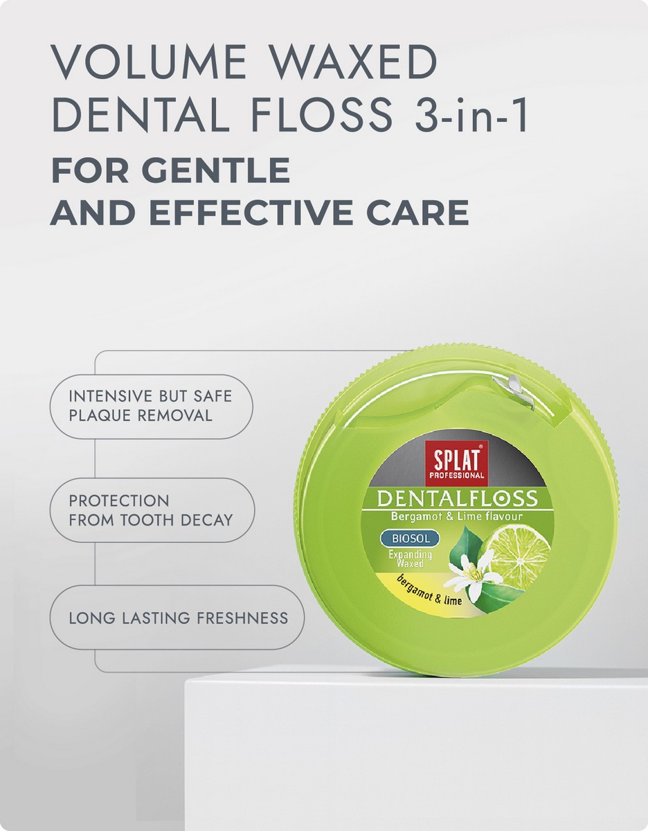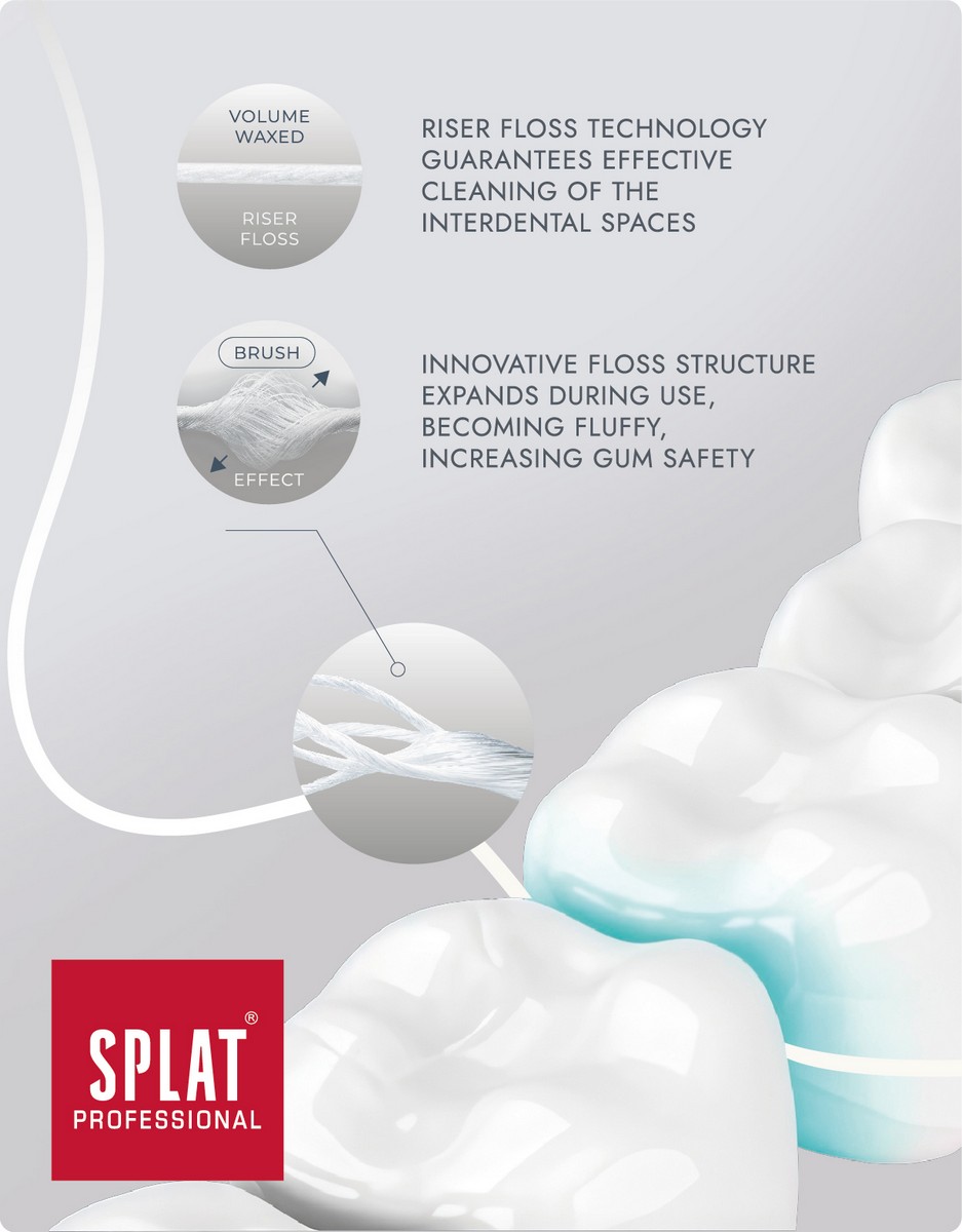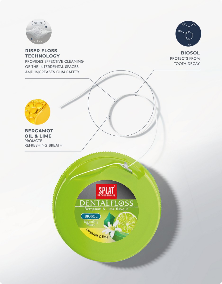 SPLAT Professional Dental Floss to nić dentystyczna o rozszerzonej strukturze, stworzona w technologii Riser Floss Technology™, która powoduje rozwarstwienie mikrowłókien, zapewniając skuteczniejsze oczyszczanie przestrzeni międzyzębowych oraz delikatną pielęgnację jamy ustnej. W połączeniu z Biosol ogranicza gromadzenie się płytki nazębnej i wspiera utrzymanie prawidłowej higieny jamy ustnej. Olejki eteryczne bergamotki i limonki zapewniają długotrwałą świeżość oddechu.