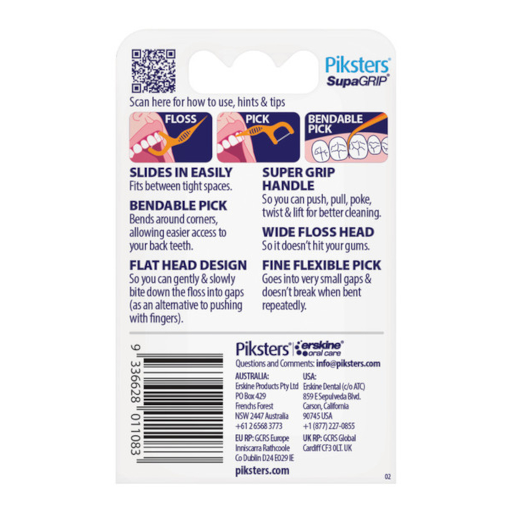 Piksters SupaGRIP FINE FLOSS to cienkie, a jednocześnie wyjątkowo wytrzymałe niciowykałaczki, zaprojektowane specjalnie do wąskich i ciasnych przestrzeni międzyzębowych. Delikatna nić skutecznie usuwa płytkę nazębną, nie podrażniając dziąseł, a ergonomiczny uchwyt zapewnia wygodę i pełną kontrolę podczas codziennej higieny jamy ustnej.