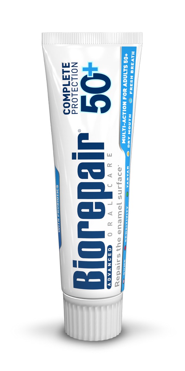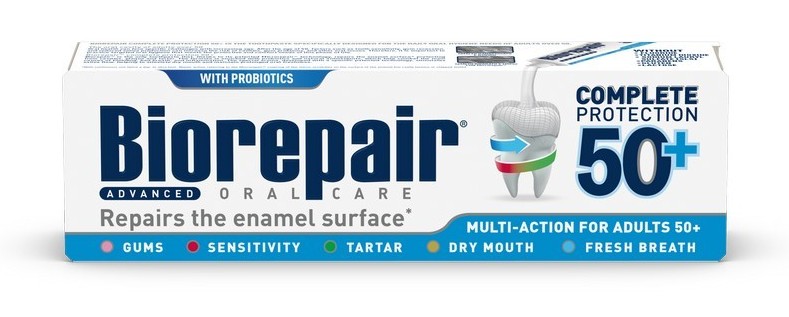 Biorepair Advanced Complete Protection 50+ to innowacyjna pasta do zębów opracowana z myślą o szczególnych potrzebach dojrzałej jamy ustnej. Wraz z wiekiem szkliwo ulega osłabieniu, a dziąsła stają się bardziej podatne na recesję i stany zapalne. Dzięki opatentowanej technologii MicroRepair®, pasta aktywnie wspiera regenerację tkanek twardych zęba oraz dba o zdrowie tkanek miękkich.