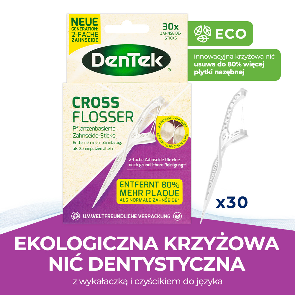 Odkryj nową jakość czyszczenia międzyzębowego w zgodzie z naturą. DenTek Eco Cross Flosser to innowacyjne rozwiązanie, które dzięki unikalnej nici w kształcie litery X usuwa o 80% więcej płytki nazębnej niż tradycyjne flossery. Wykonane z roślinnego bioplastiku, łączą zaawansowaną technologię scalingu z dbałością o środowisko, oferując kompleksową higienę jamy ustnej bez kompromisów.