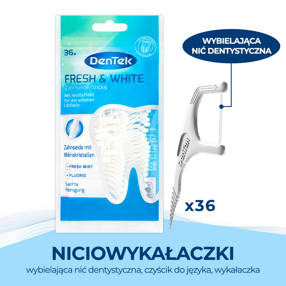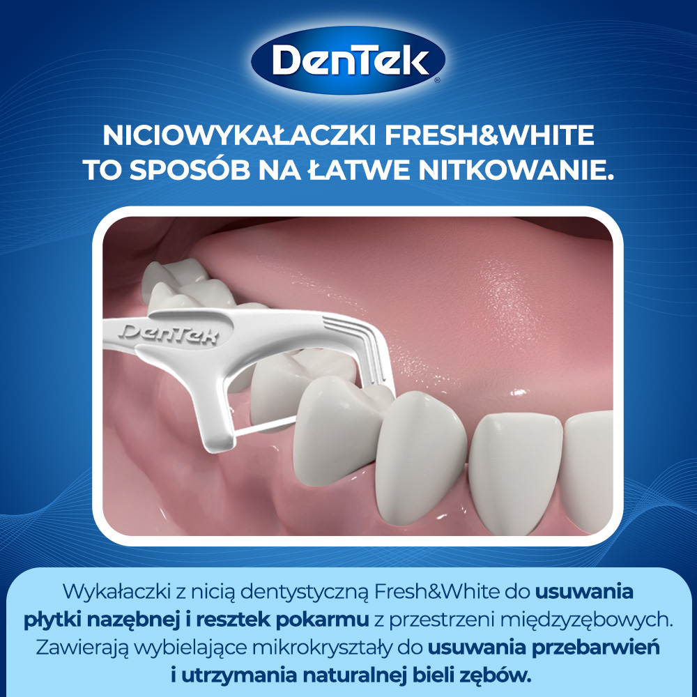 Zadbaj o zdrowy i promienny uśmiech z DenTek Fresh&White. Te innowacyjne niciowykałaczki zostały stworzone, aby nie tylko skutecznie oczyszczać przestrzenie międzyzębowe, ale również dbać o estetykę Twojego uśmiechu. Dzięki zawartości wybielających mikrokryształów, produkt pomaga usuwać przebarwienia tam, gdzie nie dociera tradycyjna szczoteczka, przywracając zębom ich naturalną biel na stykach.